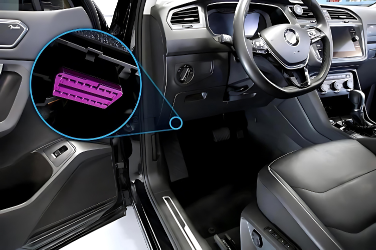 Bei den meisten Fahrzeugen befindet sich der Anschluss unter dem Lenkrad auf der Fahrerseite (siehe Abbildung). Sie können den Anschluss Ihres Autos finden, indem Sie nach „Lage des OBD-Anschlusses Ihres Automodells“ googeln.